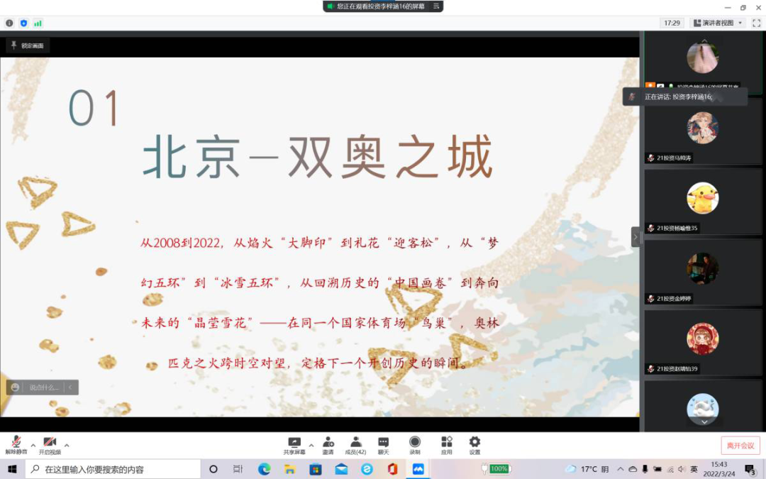 为讲好冬奥故事,传承冬奥精神,深入体会学习冬奥精神与冬奥力量,2022年3月24日,太阳成集团tyc122cc2021级投资一班团支部采用线上会议和线下活动的方式开展了“讲冬奥故事,传冬奥精神”团日活动。