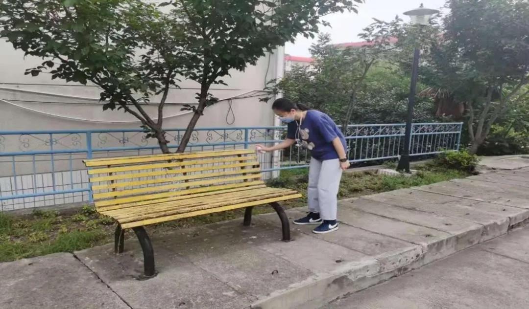 空闲之余,实践人员戴着口罩,拿着消毒液对小区内长椅、道路等公共资源进行消毒,以自身行为来影响他人,让人们去重视疫情防控,自觉的做好疫情防控。